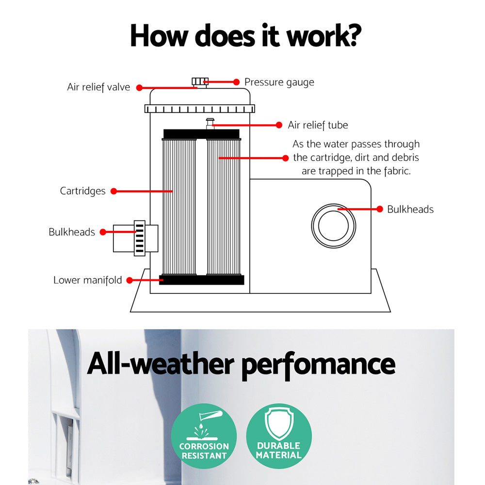 This filter pump also comes with a 5.6in x 10in filter cartridge, which traps and filters dirt and debris, transforming scummy water into clean water that you would not hesitate to jump into whenever you feel like a swim!