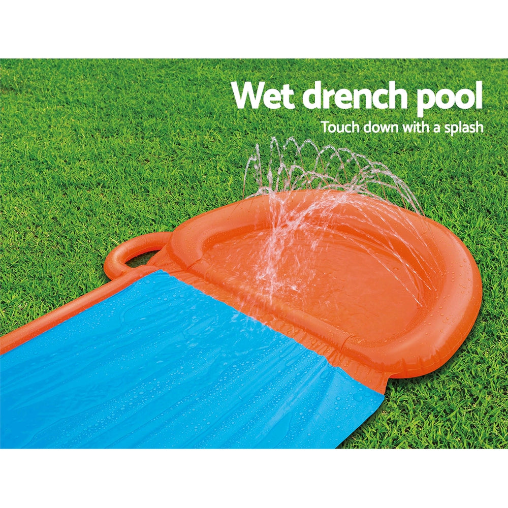 Your children will be making a splash among their friends this summer with our Bestway Inflatable Water Slide. This 5.49m long water slide is suitable for children aged between 3 and 12 and comes with everything you need to turn your backyard into a veritable water park. The inflatable speed ramp lets your children blast off at lightning speed, the water jets lining the slide keep the surface slick and smooth for them to maintain their sliding speed from start to finish and the wet drench pool at the end allows them to touch down with a big splash. Setting up the slide is easy – just inflate the slide and connect your garden hose. Built with durable pre-tested vinyl with a smooth surface and ground stakes included to keep everything securely in one place, the water slide is completely safe for your children to slide on for many summers into the future. Plus, a repair patch is also included for any unforeseen tears. So get ready for summer with our water slide and let your children have a splashing great ride.