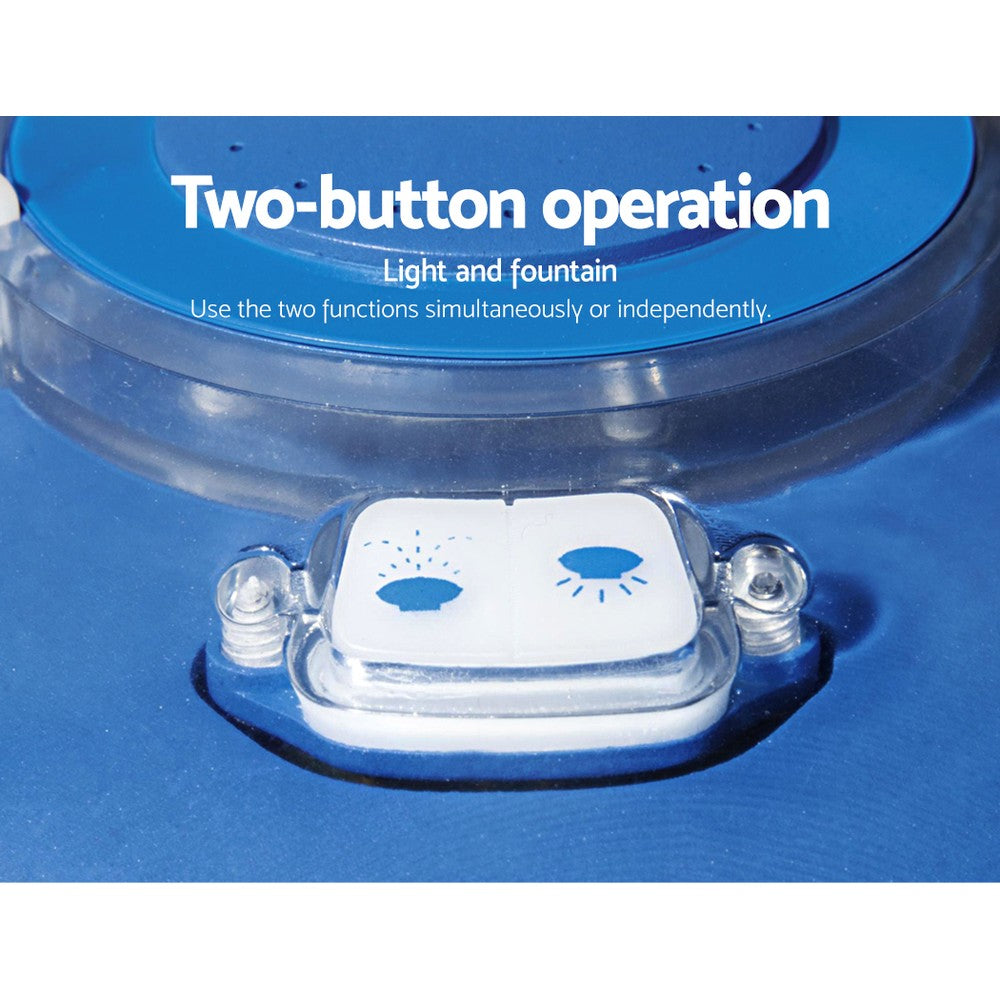 Enjoy spectacular light and water shows on your own backyard pool with our 2-in-1 Bestway LED Floating Pool Fountain. The fountain sprays water up to 1m high and has two patterns – pulse and high beam. The LED light illuminates both the pool bottom and the water sprays to create a beautiful ambience. It flashes in red, green and blue colours with three flashing patterns – random, fast and slow. Operating the fountain is easy with simple two-button control, and the light and fountain functions can be used simultaneously or independently to suit your preference. The built-in rechargeable lithium battery lasts up to 3 hours on full charge and the fountain automatically turns off after one hour to save energy. Durably constructed with IP67 waterproof rating and designed to float on water, just turn it on and place on the pool surface to create a brilliant display that will mesmerise. The perfect colourful decoration for your pool parties or any night-time functions.