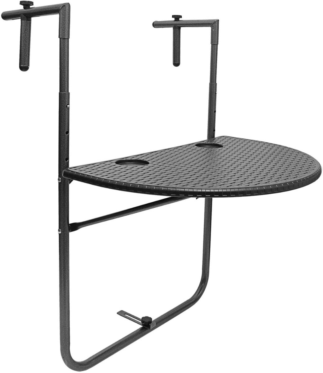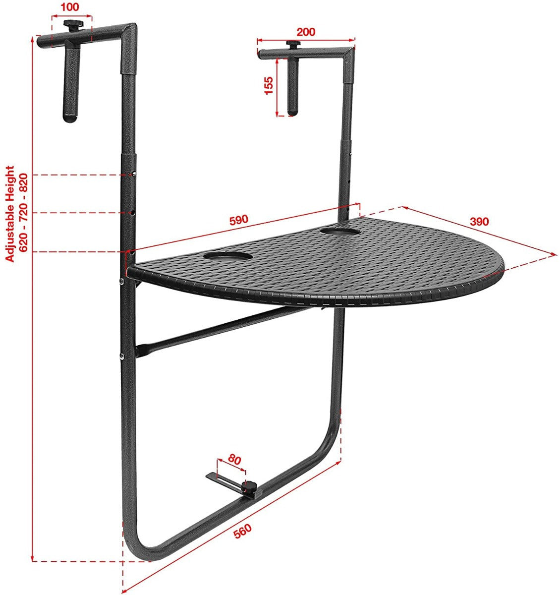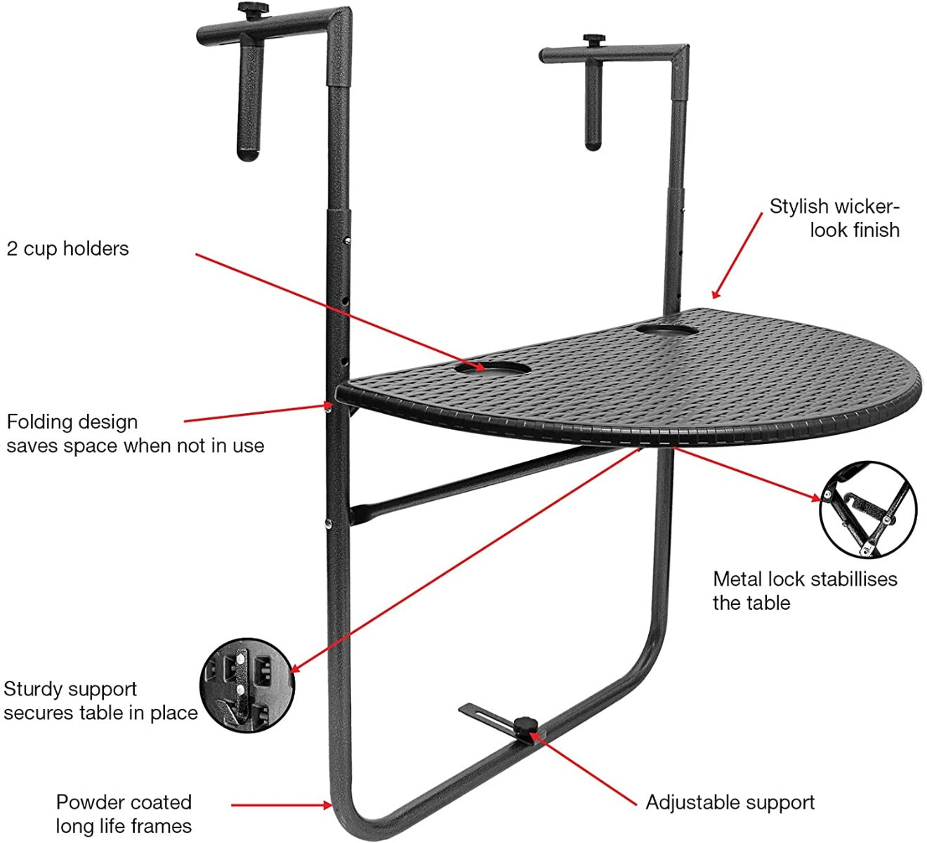This table is ideal for balcony living. The stylish wood grain finish design sits over top of the railing to be used as a table or a shelf. This item has metal frame with shelf wood grain finish