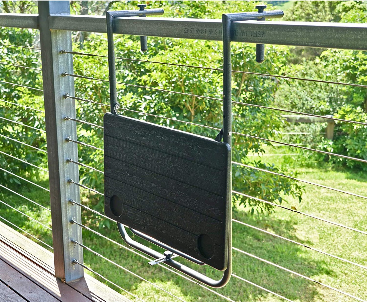 This table is ideal for balcony living. The stylish wood grain finish design sits over top of the railing to be used as a table or a shelf.