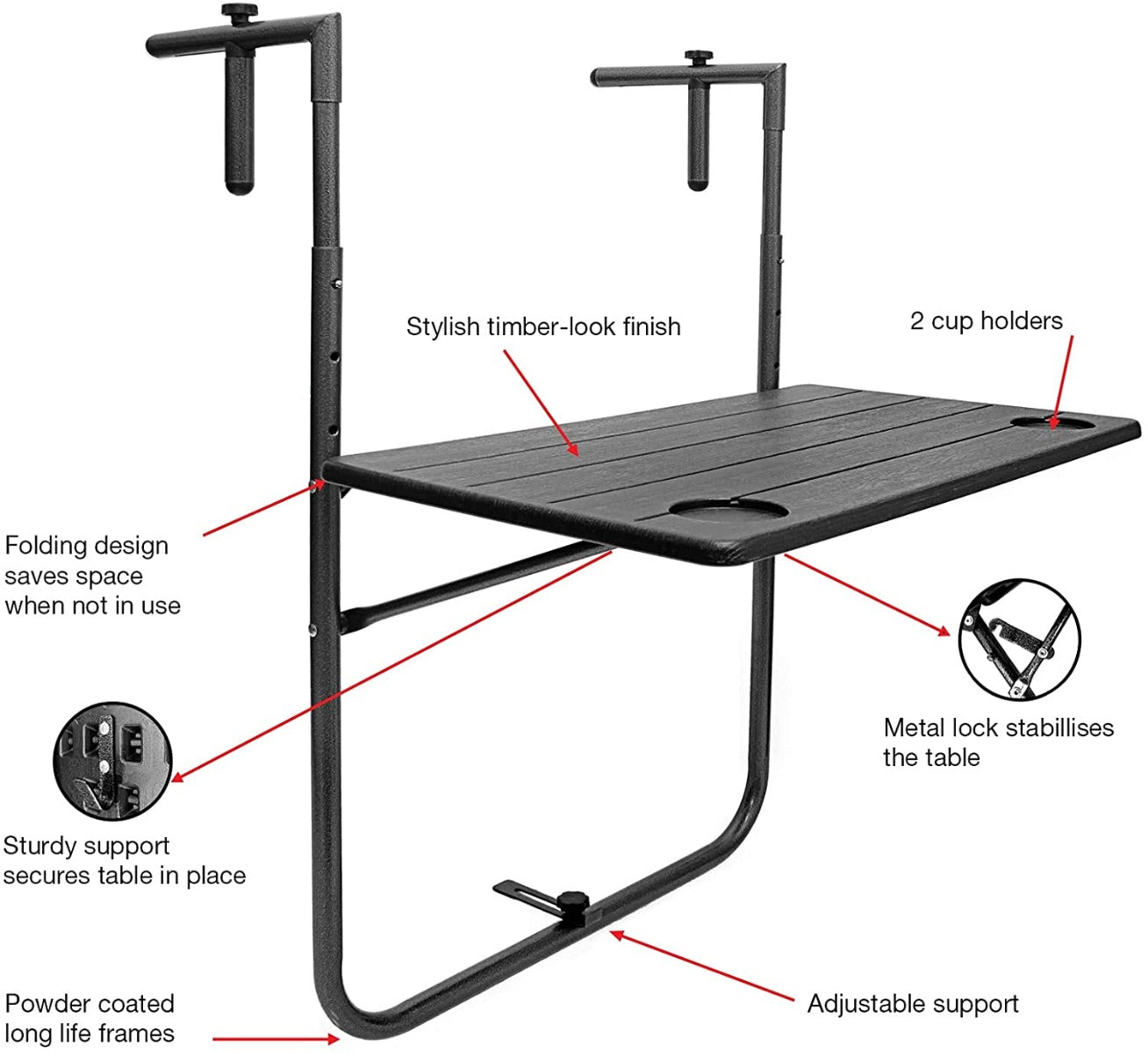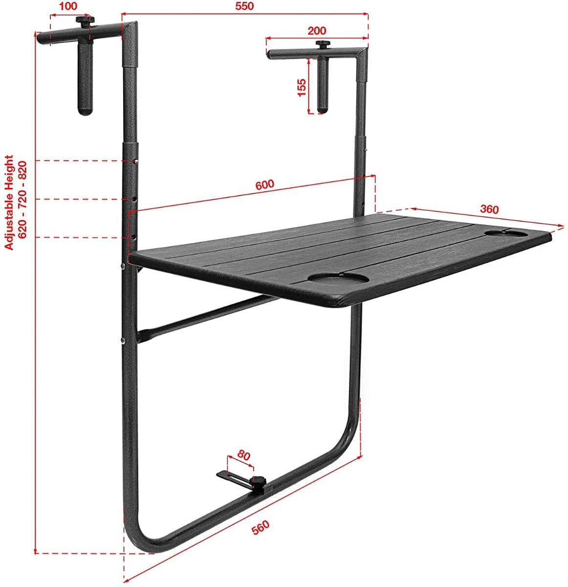 The table can be adjusted for different heights and railing widths: 65mm - 160mm
