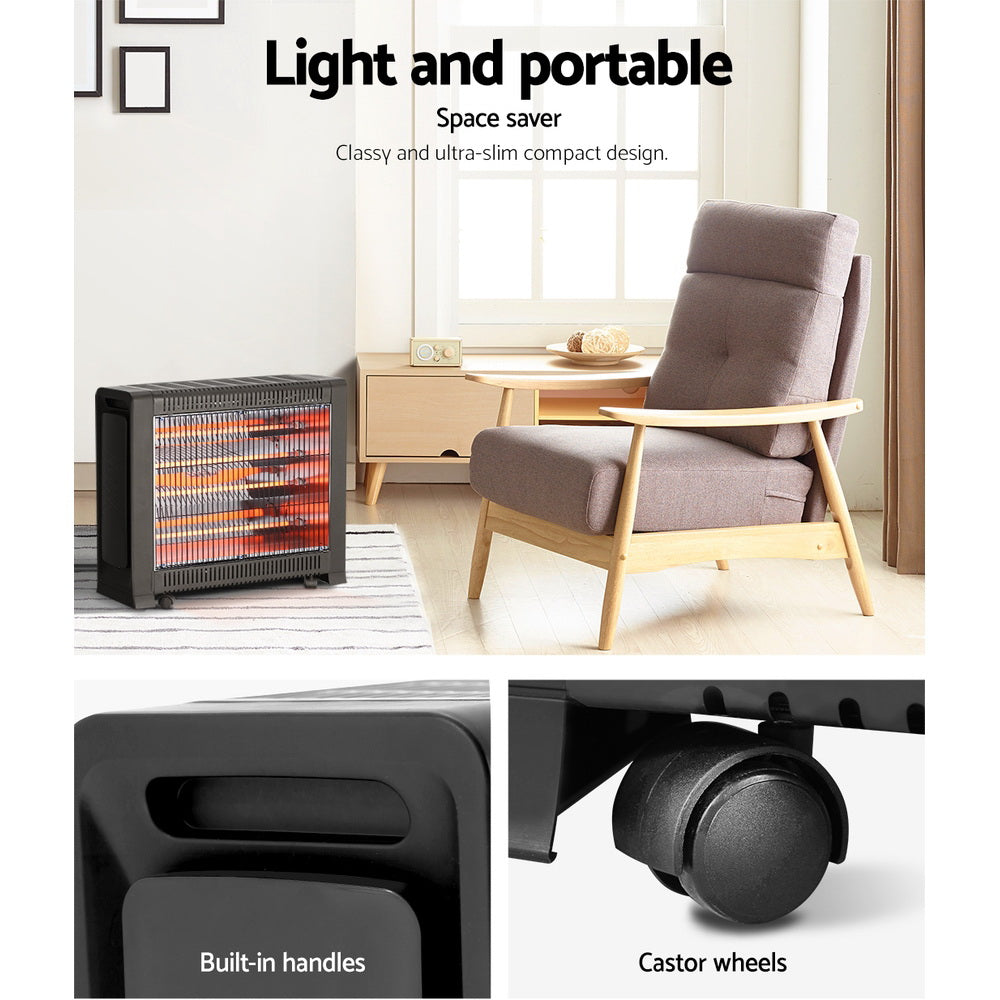 Just like the way that the sun heats up the earth, the Devanti Infrared Heater works in a similar fashion to provide soothing sun-like warmth with its reflective heating technology. With our infrared heater, there are no odours, fumes or carbon dioxide emissions and up to 95% of the energy generated is converted to useful heat. This is because infrared heating warms up the object and not the air around it. With its more targeted and rapid heat build up, the eco-friendly heater is certainly more energy efficient and cost effective in every way. It also features an adjustable thermostat to suit your heating requirements with its four high-quality quartz heating elements. And with no moving parts, the Heater Panel works silently and is virtually maintenance-free. Not least, the highly portable infrared heater is fitted with wheel castors for easy mobility and built-in handles to assist with hassle-free movement.