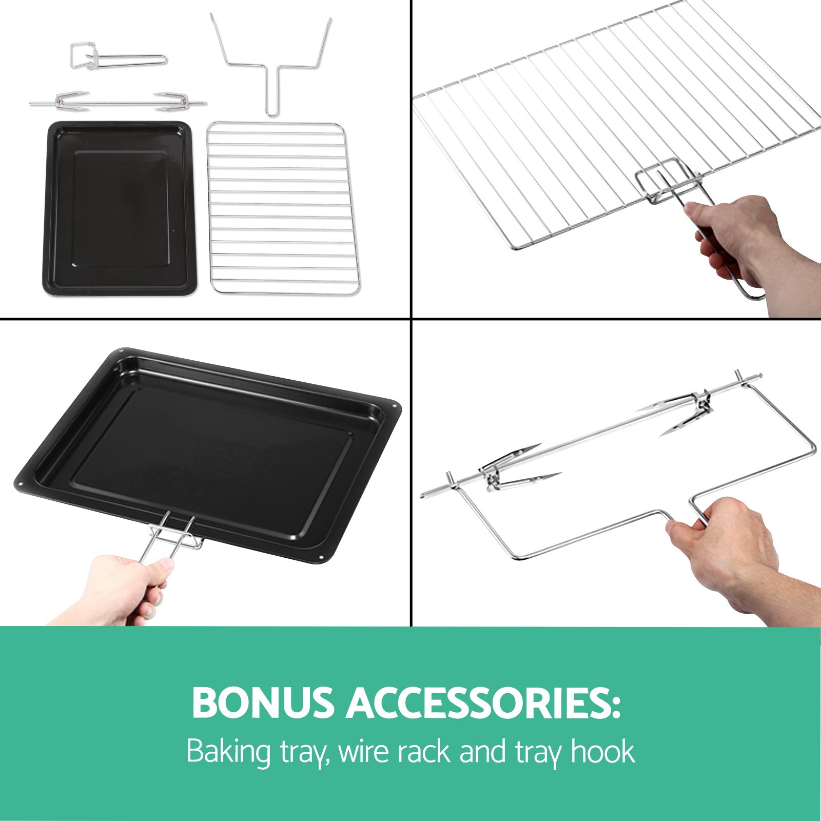 Bonus accessories: Baking tray, wire rack, tray handle, rotisserie and rack