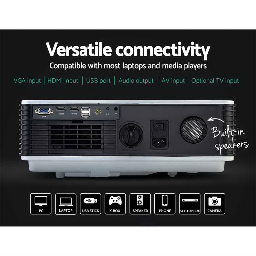 Enjoy epic entertainment with our Devanti Video Projector. From your small screen to the big screen, our video projector gives you larger than life viewing. In fact, you can adjust the screen size from 50 inches up to a massive 200 inches. And with its ultra-expansive colour gamut, the projector delivers crisp clear images with more brilliant colours and is fully HD 1080P compatible. It also features a built-in heavy bass speaker and a maximum 3200 lumens lamp with a long lifespan of up to 50,000 hours. Best of all, you get a wide screen experience from a relatively short projection distance. Not least, you have HDMI, USB, VGA, AV and 3.5mm audio ports for fast connection to multiple devices such as external speakers, game consoles and hard disks. A remote control and bonus VGA cable and AV audio cable are also included.