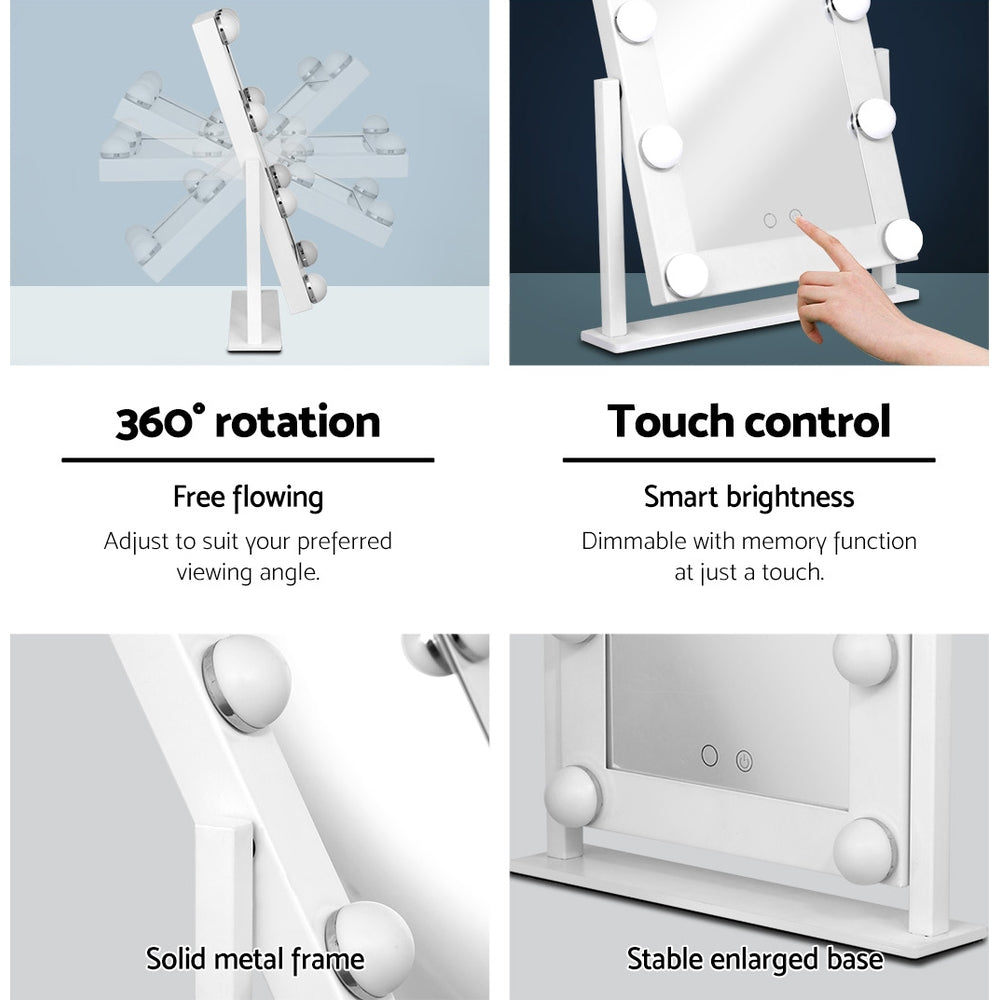 our standing makeup mirror features nine LED bulbs on its metal frame. The lighting is dimmable with a touch control for brightness and colour, from cool white to warm white. The mirror is totally rotatable and stands on an enlarged base for added stability. The LED bulbs has a lifespan of 50,000hrs and is energy-efficient.