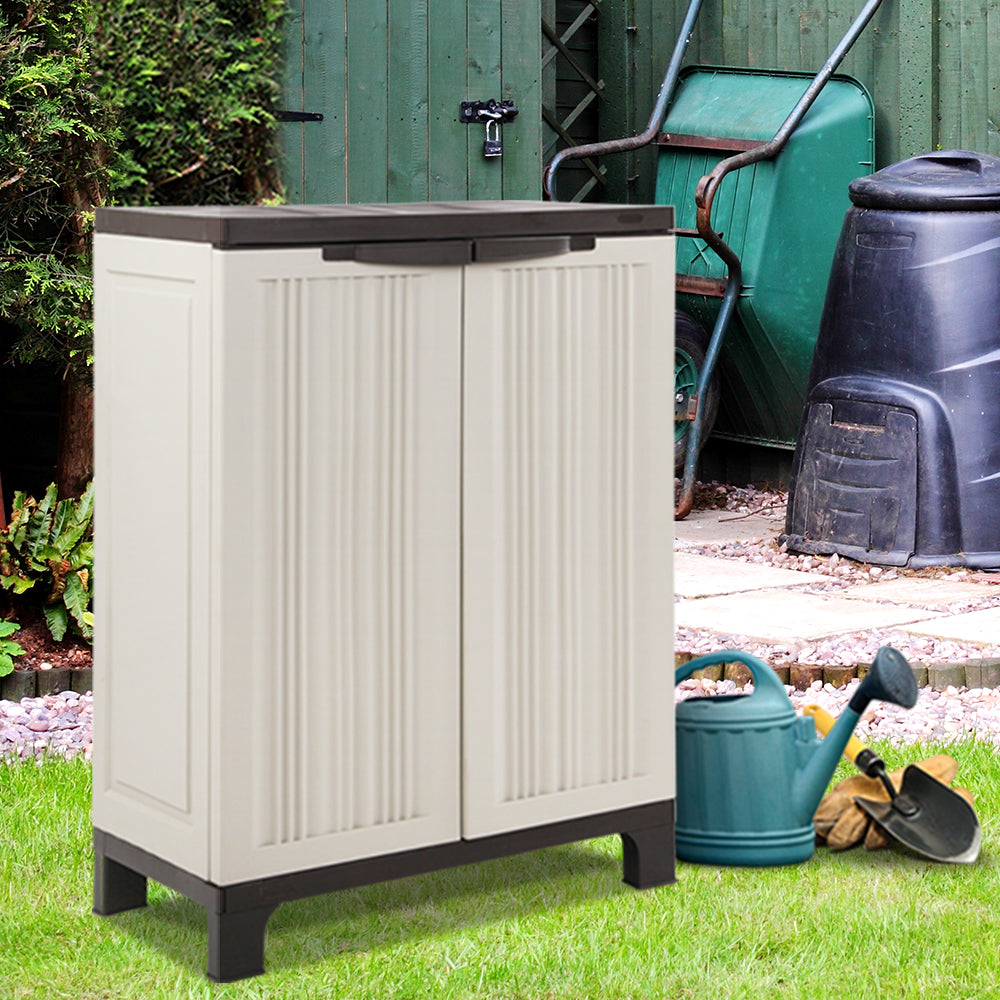 Outside, it shares similar attributes of the full-size cabinet with the same corrugated panel design for added support and style. The weather-resistant premium plastic construction ensures longlasting use while the stilted feet protects it against spills, floods or wet ground. No worries there of where you want to place it.