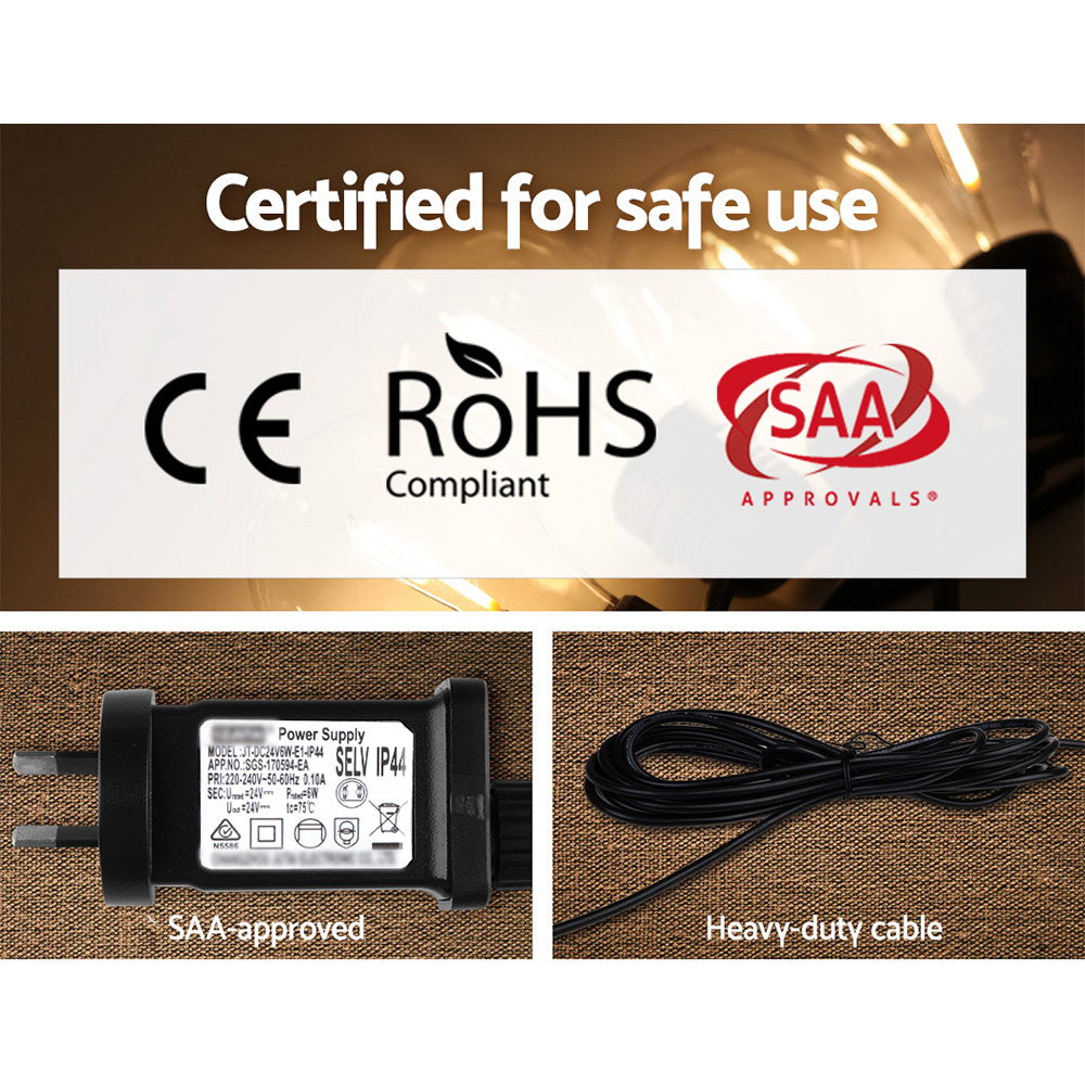 Our Jingle Jollys Festoon String Lights are great not only for wedding and birthday parties or special events, but also for creating a warm, inviting ambience with its bright and mellow glow. Suitable for both indoor and outdoor use, its IP44 rating means that it can be used in the rain and all weather conditions. Each bulb draws a very low voltage and is placed 90cm equally apart from each other throughout its 23m length for an even distribution of illumination and brightness. Not least, the each bulb has a 20,000 hours lifespan so that you can get to use the string lights for quite a while.