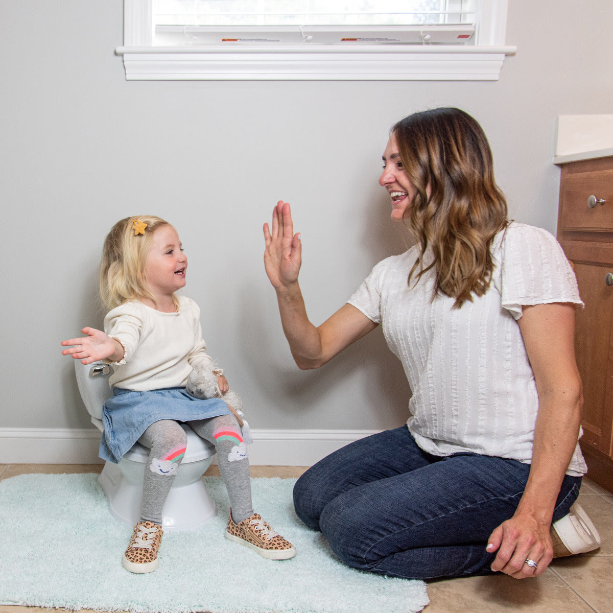 Make potty training easier with the Summer® My Size® Potty Lights and Songs Transitions. It includes interactive lights and entertaining melodies with the touch of a flush. The potty cycles through six different melodies and lights flash to the beat of the music to reward your little one. The removable potty topper can be placed onto the adult toilet for a smooth transition. This toddler potty also includes a built-in wipe compartment that promotes good hygiene habits. This easy to clean potty includes a splash guard and removable bowl.