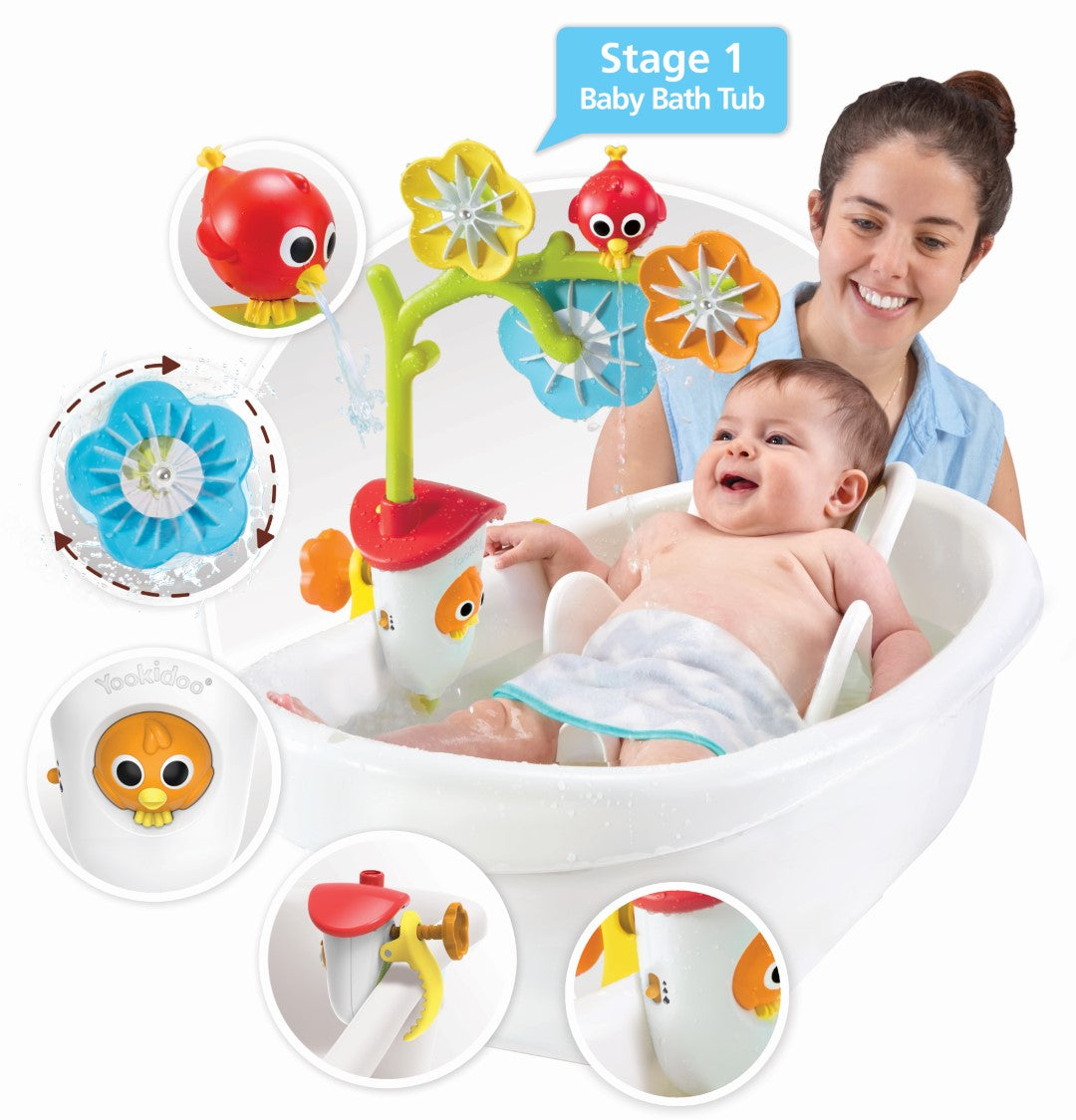 Battery operated sensory bath mobile with colourful flowers that spin and sprinkle while swivelling bird sprays a gentle stream of water.